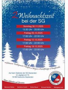 Zum 2. Mal lädt die SG/DJK Daxlanden zu ihrer Weihnachtszeit auf dem Gelände der SG/DJK Daxlanden im Jagdgrund ein.