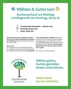 Der Förderverein der Grundschule Daxlanden bietet am Sonntag,08. März, dem Tag der Landtagswahl 10 -14 Uhr im Zimmer 004 Kaffee und Kuchen an.
